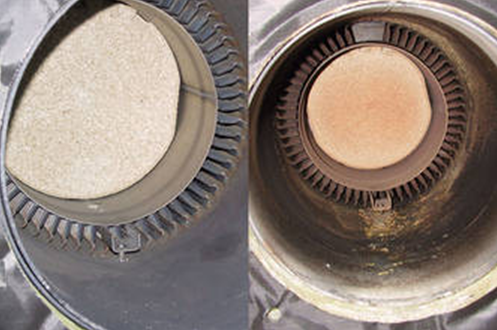 Schwefelarmes Heizöl verbrennt nahezu rückstandsfrei: links die Brennkammer eines neuen Heizkessels, rechts dieselbe Brennkammer nach einem einjährigen Betrieb mit schwefelarmem Heizöl.